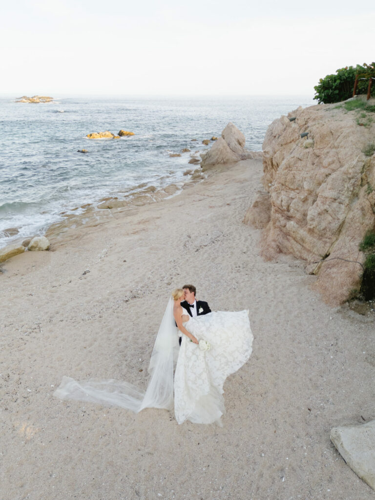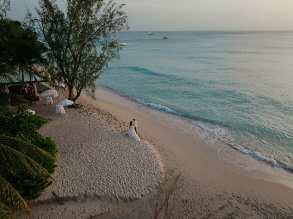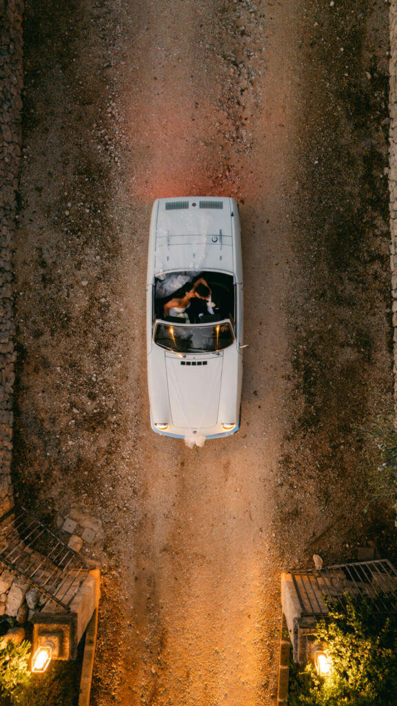 Aerial wedding shots blend the gown with its surroundings, turning dress and destination into one unified vision. Whether your ceremony overlooks the ocean or unfolds beneath centuries-old trees, a bird’s-eye image captures both the grandeur of the moment and the intimacy of its details.