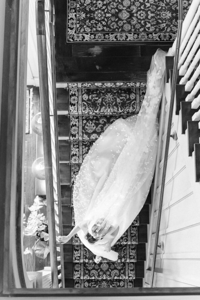 From above, the dress is not just worn, it is seen in full bloom. A Mira gown becomes a landscape of light and texture: cascading tulle flowing like a stream, floral appliqués blooming along a cathedral aisle, every layer designed for artistry in motion.