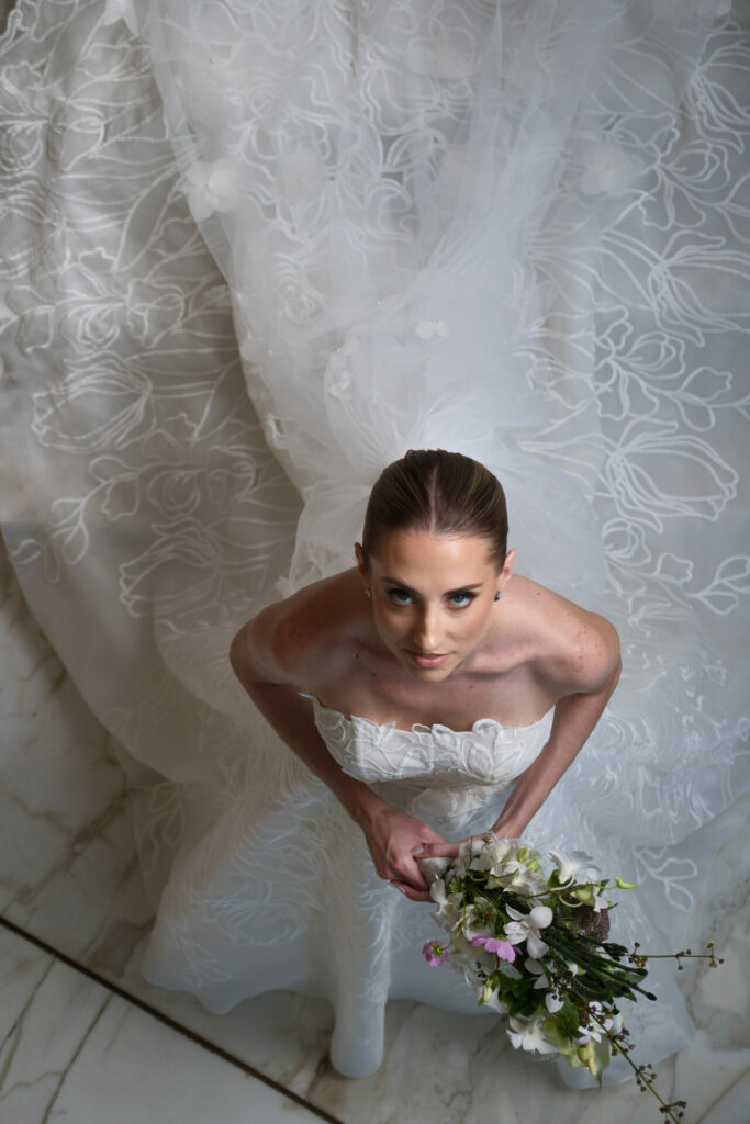 There’s a quiet kind of magic in seeing a love story from above. From this elevated view, each detail, the delicate arch of a train, the shadow of lace on stone, the whispered path of petals, takes on a new life. For our Mira Zwillinger brides, bird’s-eye wedding photos are more than beautiful images. They’re a living memory: artful, emotional, and deeply personal.