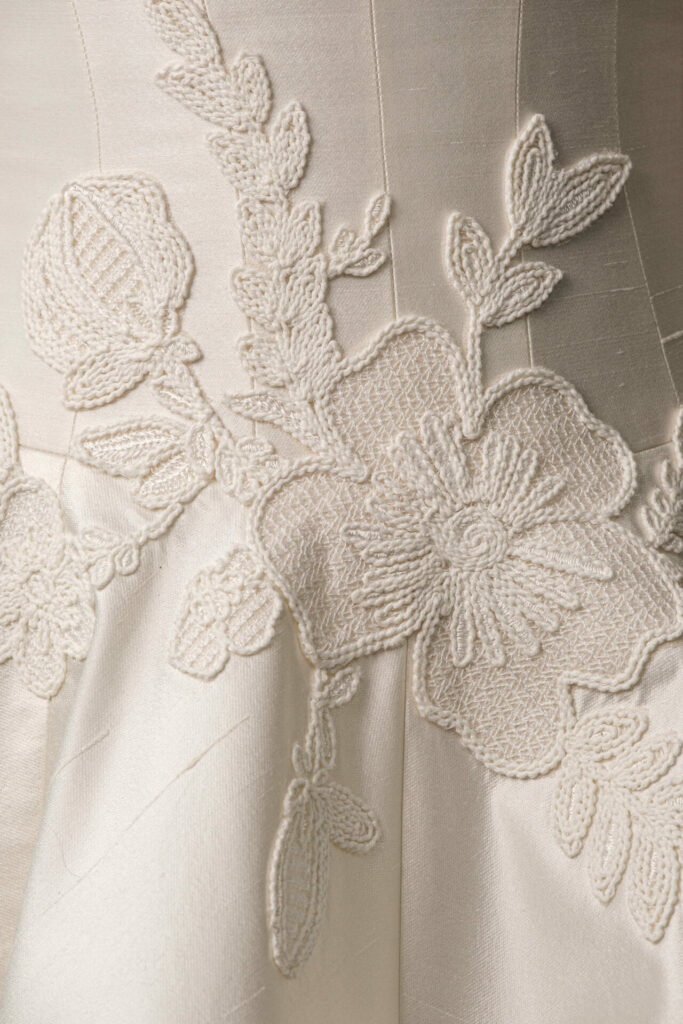 These florals flow organically into the skirt, introducing dimension and softness against the structured silhouette. The result is a gown that feels alive – textural, expressive, and entirely unique.