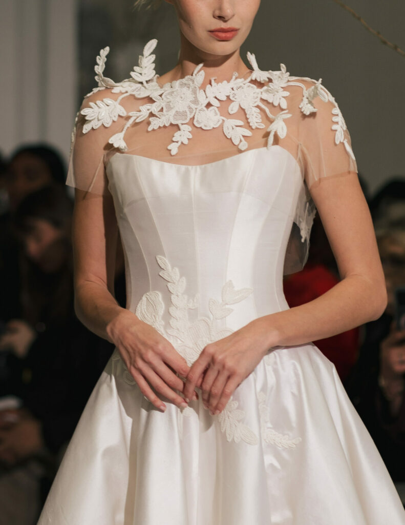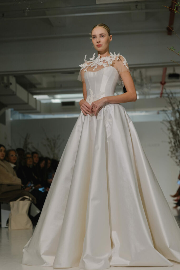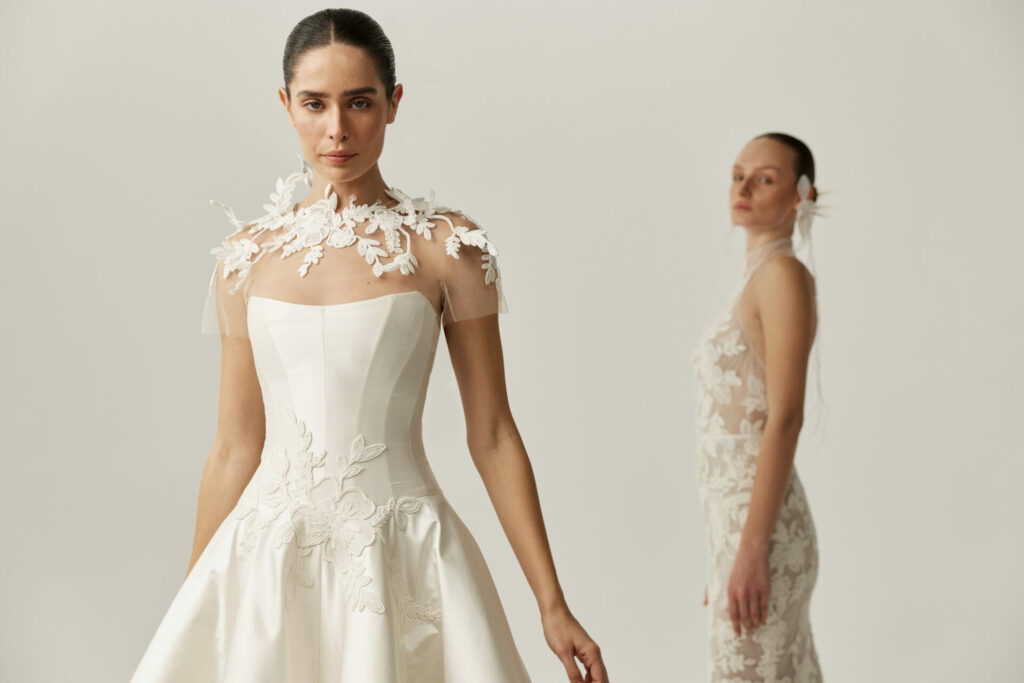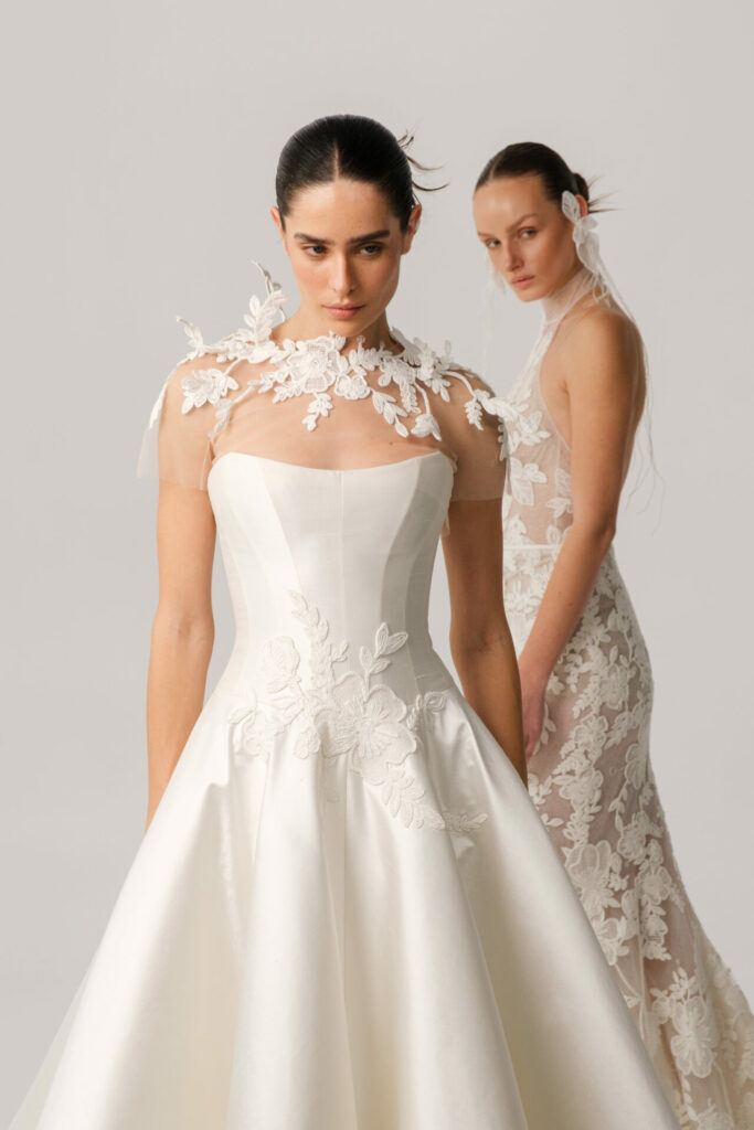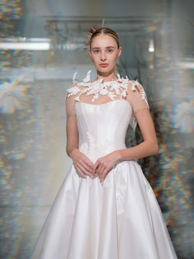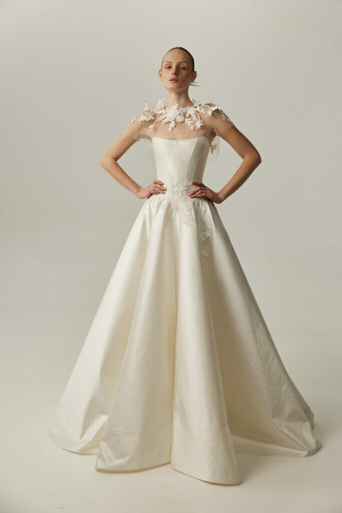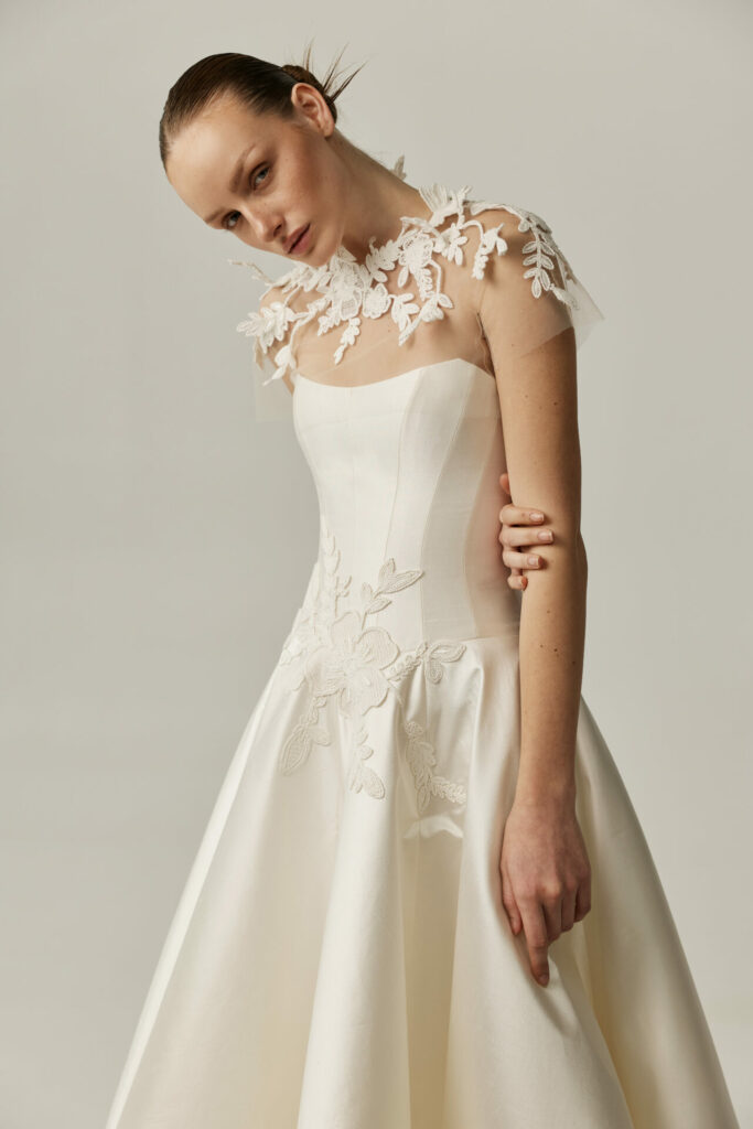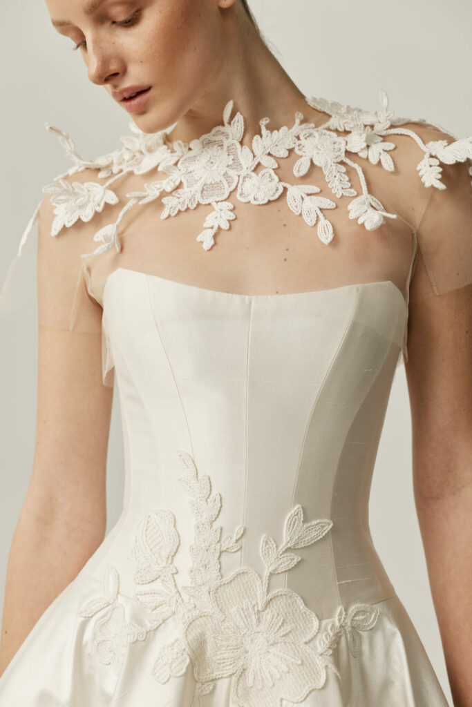 For brides seeking an added moment of drama, Anjela can be styled with a detachable sheer cape.