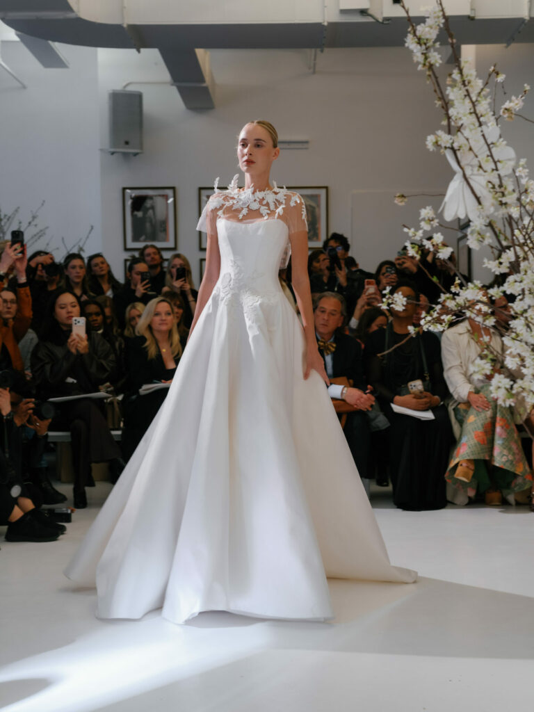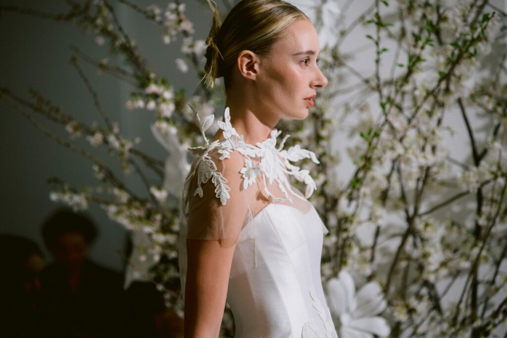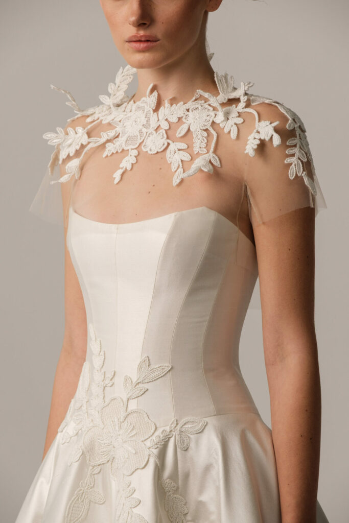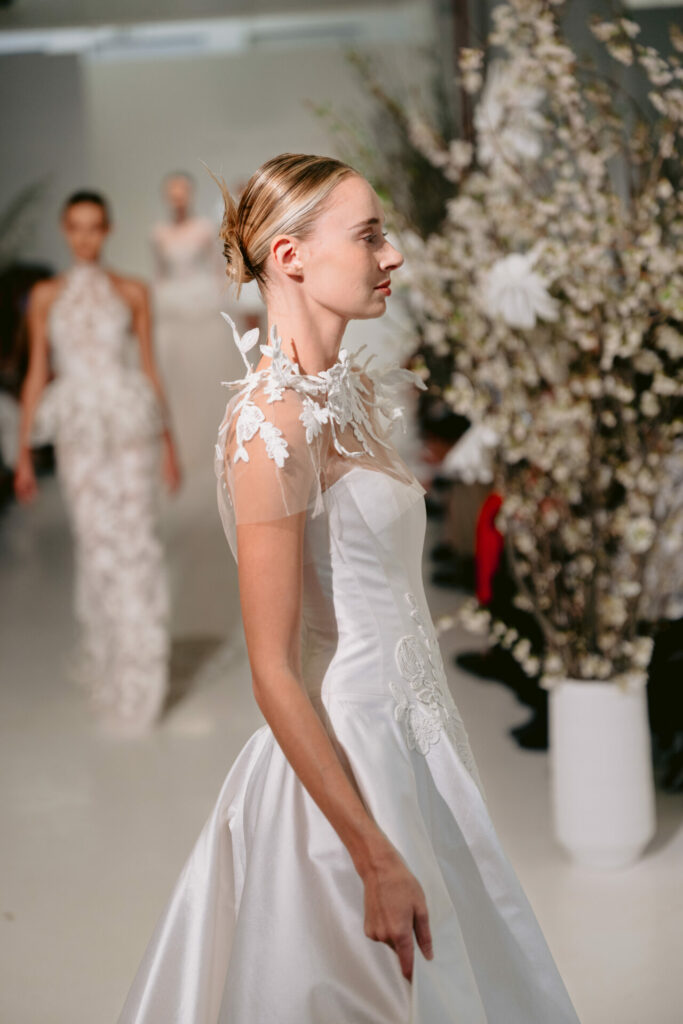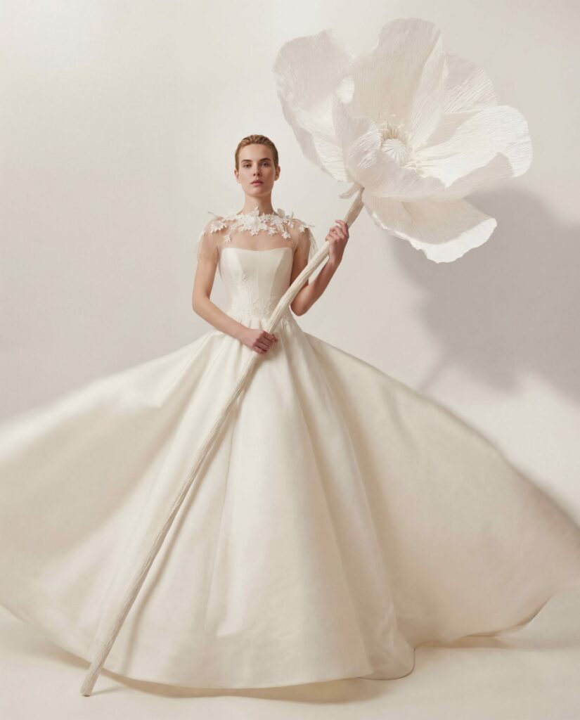 Embroidered with matching florals, the cape extends the gown’s artistry beyond the body. Subtly wired elements allow the motifs to float and evolve in three-dimensional form—creating a sculptural effect that transforms the entire look into a couture statement.