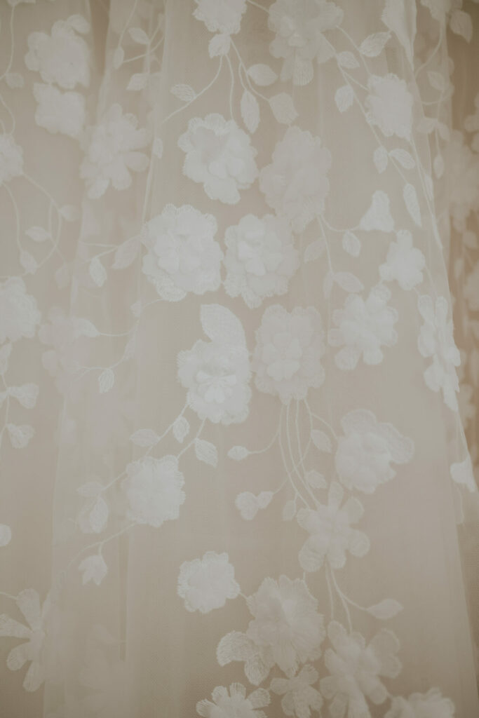 One of the most striking elements of the Milli gown is its gradient detailing, which adds depth without weight. The florals seem to dissolve and reappear throughout the gown, creating a soft, almost dreamlike transition across the fabric.