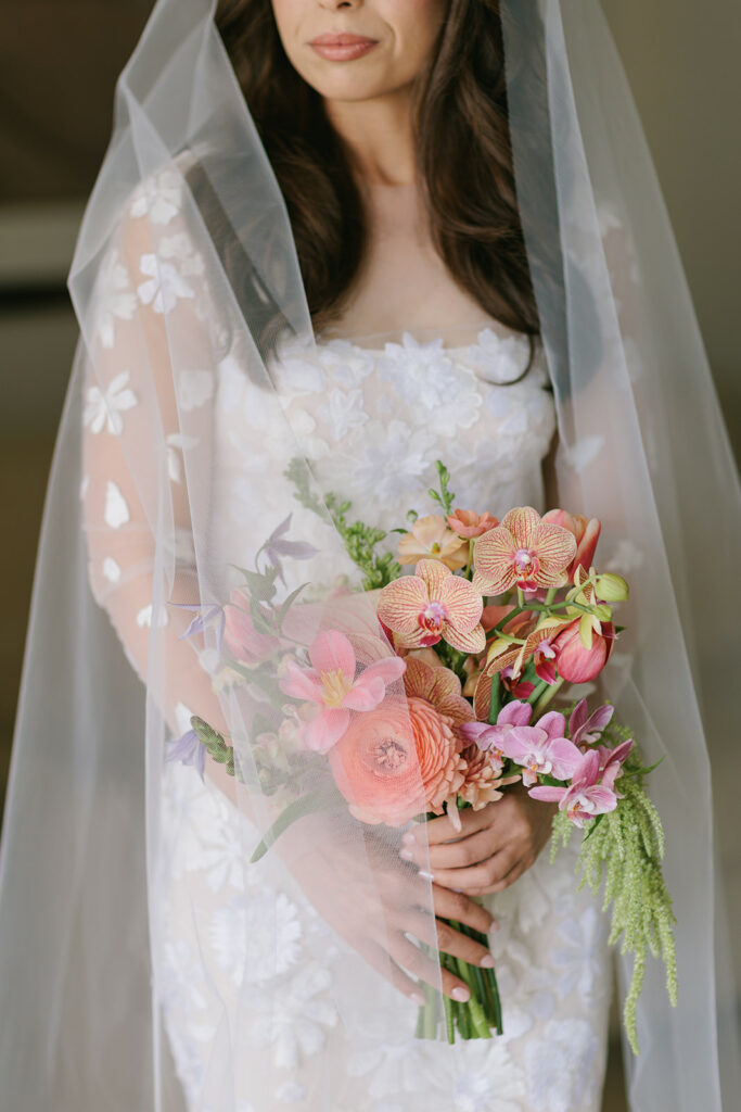 Her vision came to life through a custom-made matching topper, designed to seamlessly echo the gown’s delicate lace and floral artistry. More than an accessory, it became a transformation allowing her to move from ceremony to celebration with effortless grace.