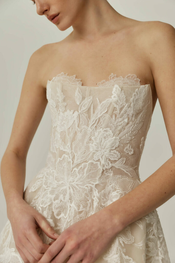 Mica is a romantic A-line wedding gown that balances softness with sculptural couture detail. Designed for the bride who is drawn to timeless silhouettes with a subtle edge, the gown offers a modern interpretation of historical corsetry through refined construction and delicate floral artistry.