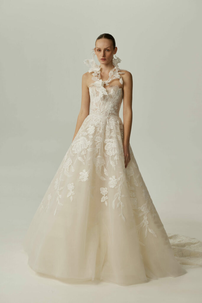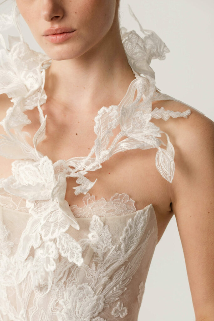 For a more fashion forward finish, Mica can be styled with a sculptural lace neckpiece crafted from the same lace as the gown. This couture accessory adds a bold, editorial accent while echoing the floral language of the design.