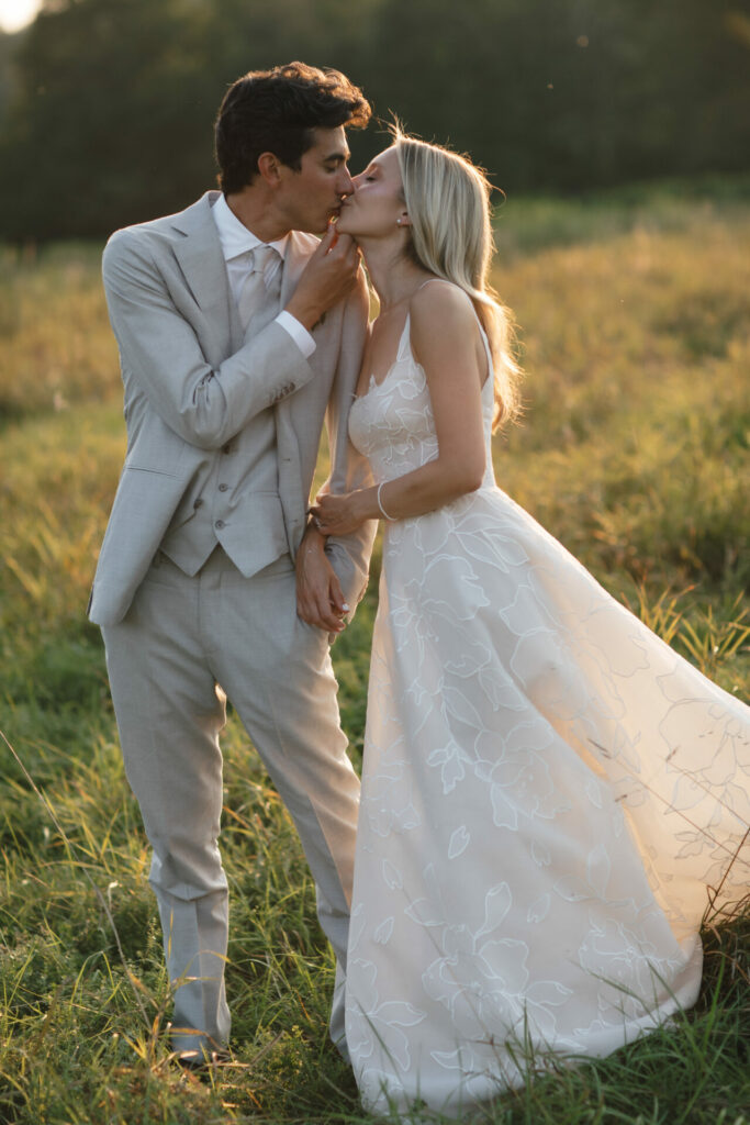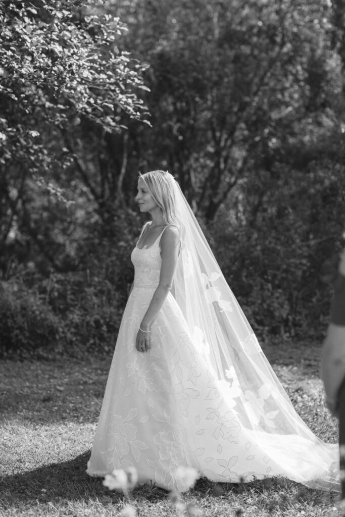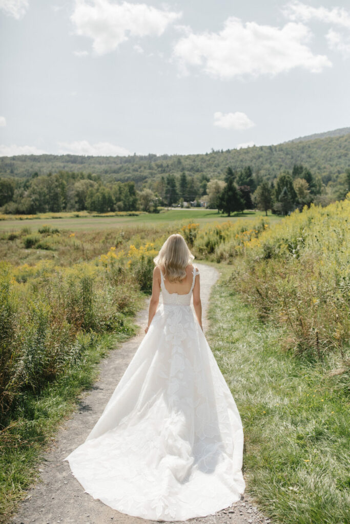 The bodice flows naturally into a lightweight A-line skirt, creating a silhouette that’s as comfortable as it is enchanting. Airy in construction and full of movement, the gown is perfect for brides who want to feel ethereal yet unrestrained.