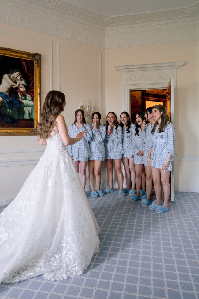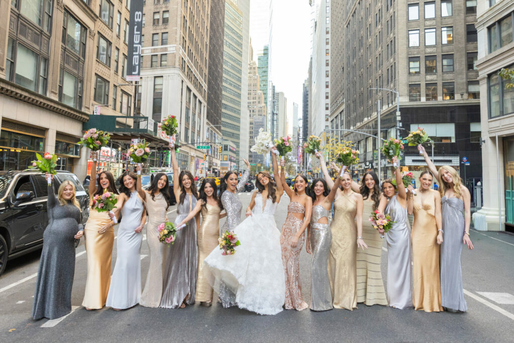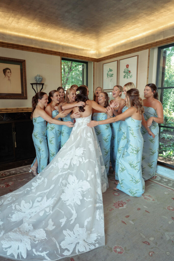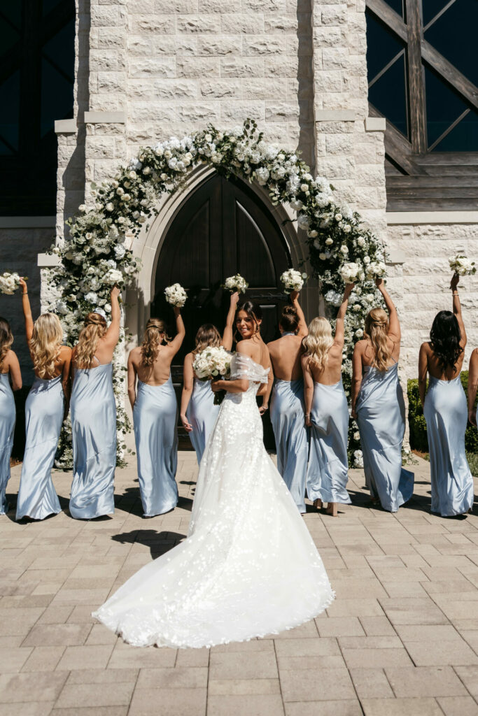 Bride smiling, bridesmaids in blue dresses raise bouquets.