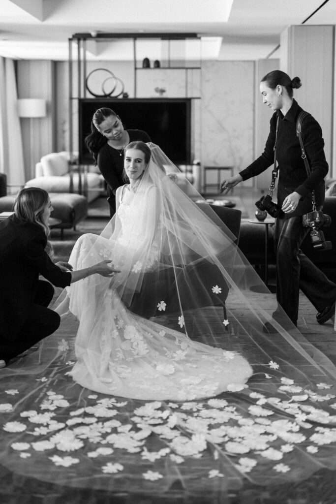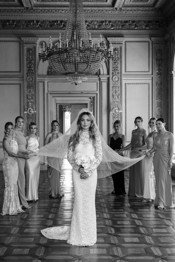 Bride and bridesmaids under chandelier, black and white.