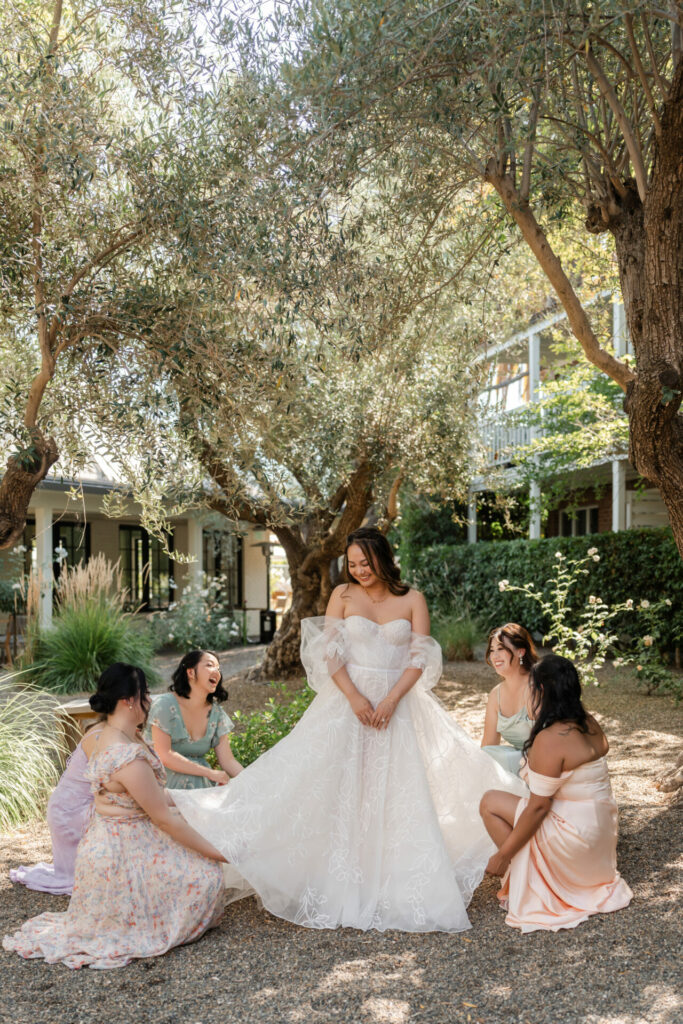 Bride and bridesmaids in pastel dresses smile outdoors.