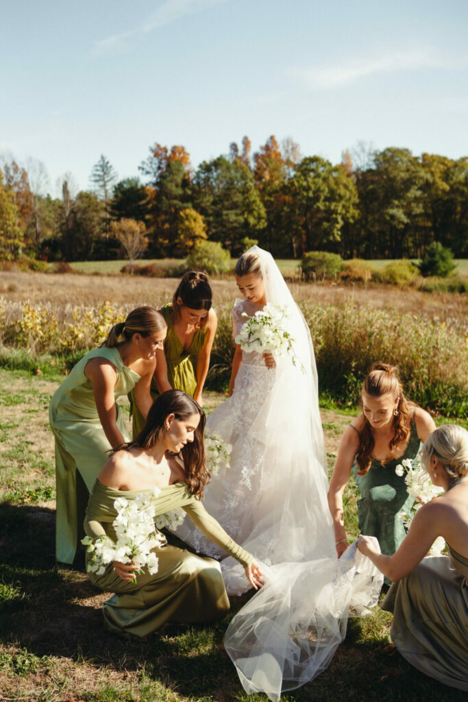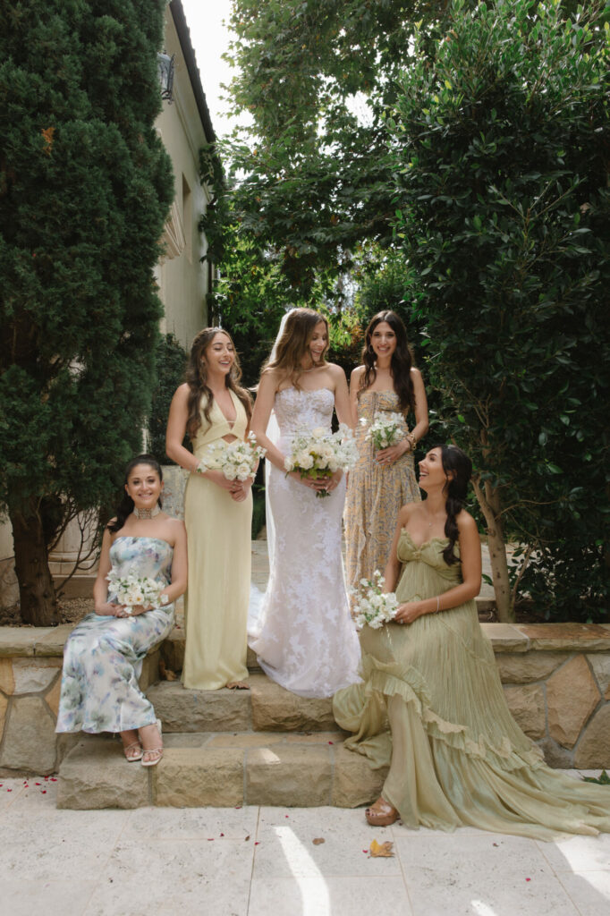 Bride in white with four pastel bridesmaids outdoors.