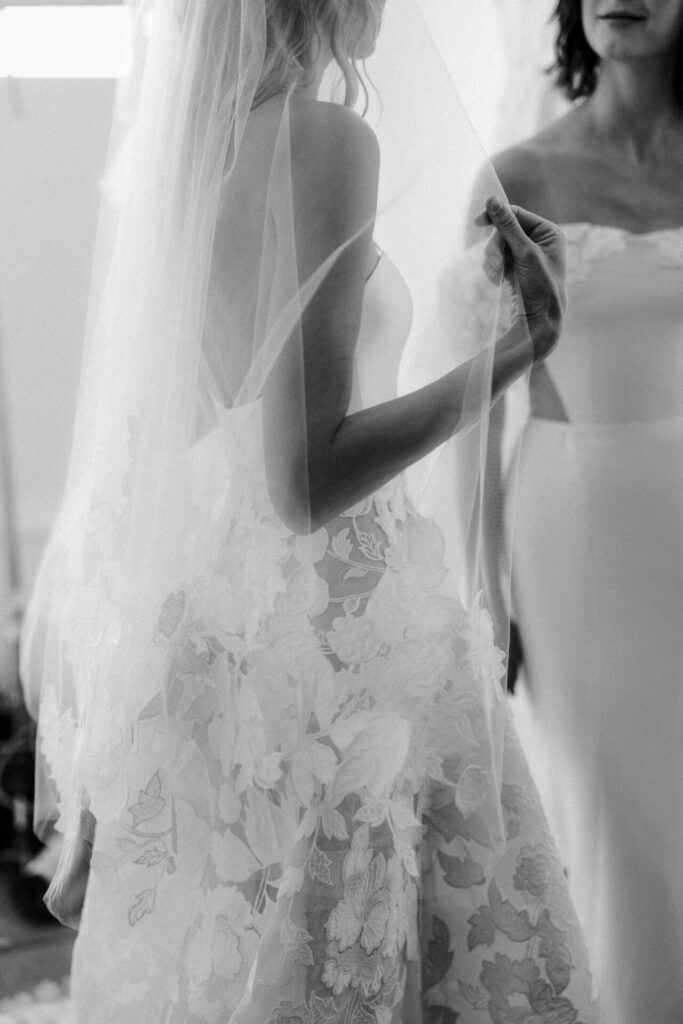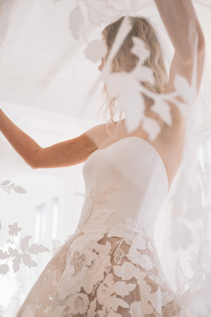 The final touch? A custom veil with a short front blusher, edged in handcrafted florals. It gently frames the bride in soft, romantic aura, whispering elegance without saying a word.