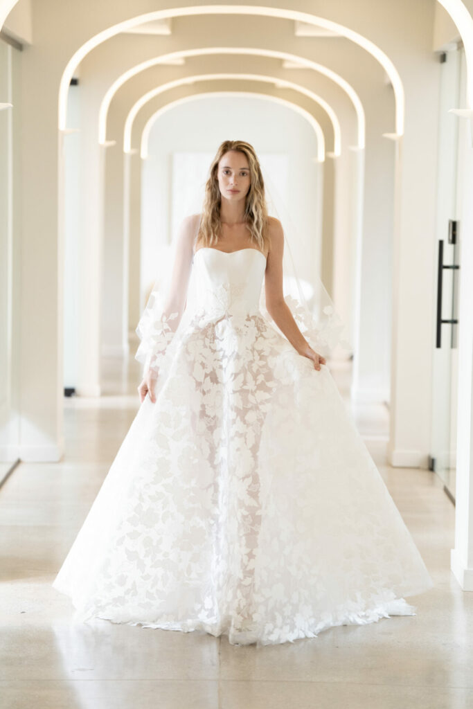 Jase is for the bride who wants airiness without excess. A clean silk corset forms the structured heart of the gown—pure, sculptural, and modern. From there, the skirt blossoms into weightless beauty: layers of embroidered cotton florals cascade with an effortless lightness, thanks to Mira Zwillinger’s proprietary technique for creating rich volume without heaviness.