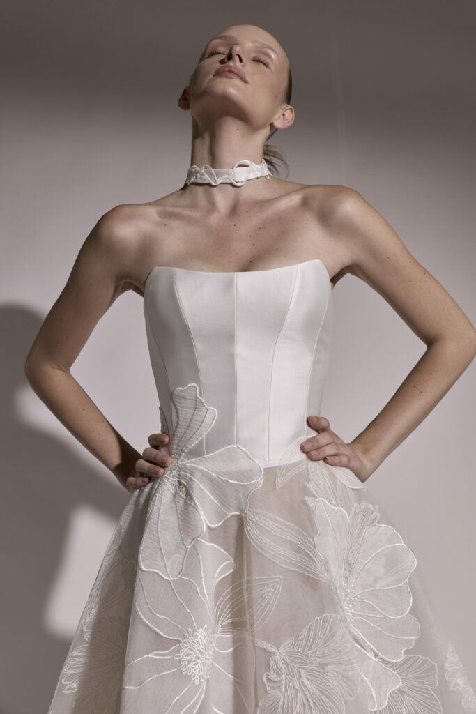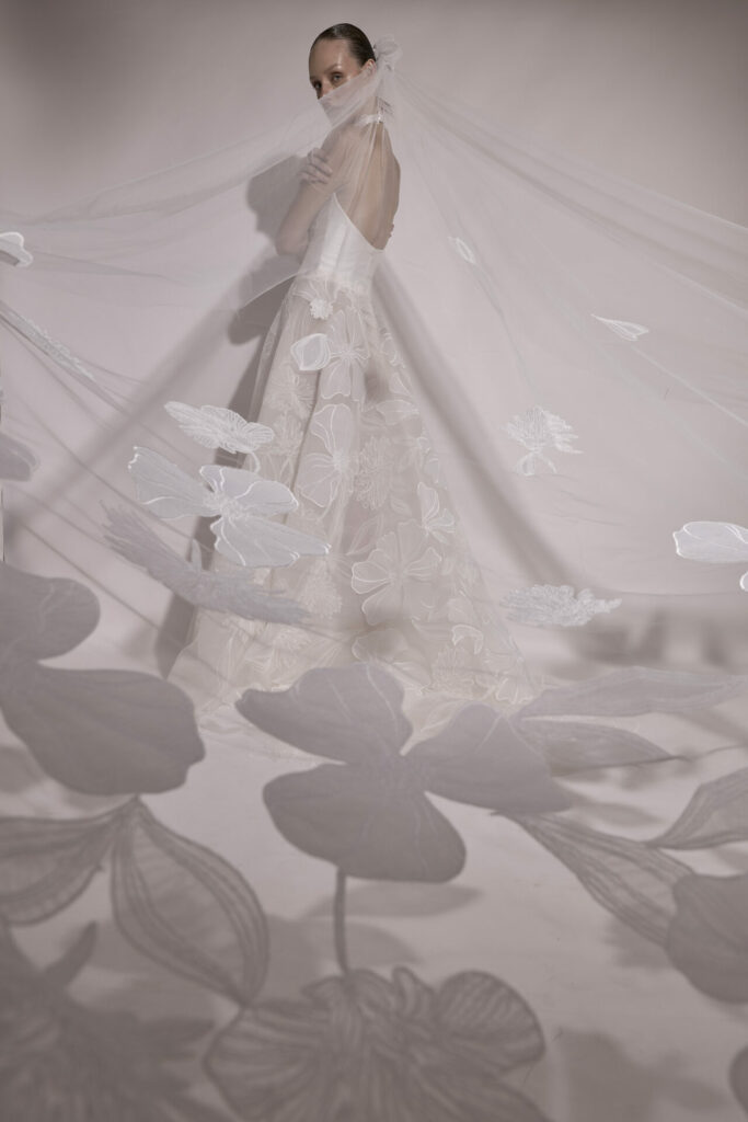 Where Merry offers sculpted power, Mayra brings softness and movement. Her strapless cat-eye corset, delicate and adorned with sheer 3D leaves, offers a more organic take on structured elegance. The same voluminous tulle skirt connects her to Merry, but Mayra’s floral story unfolds through organza flowers that appear to float, creating an effortlessly artistic silhouette.