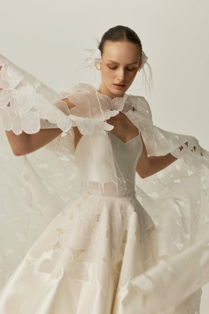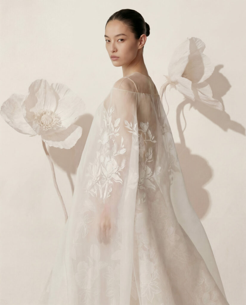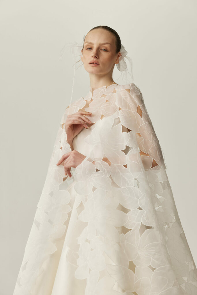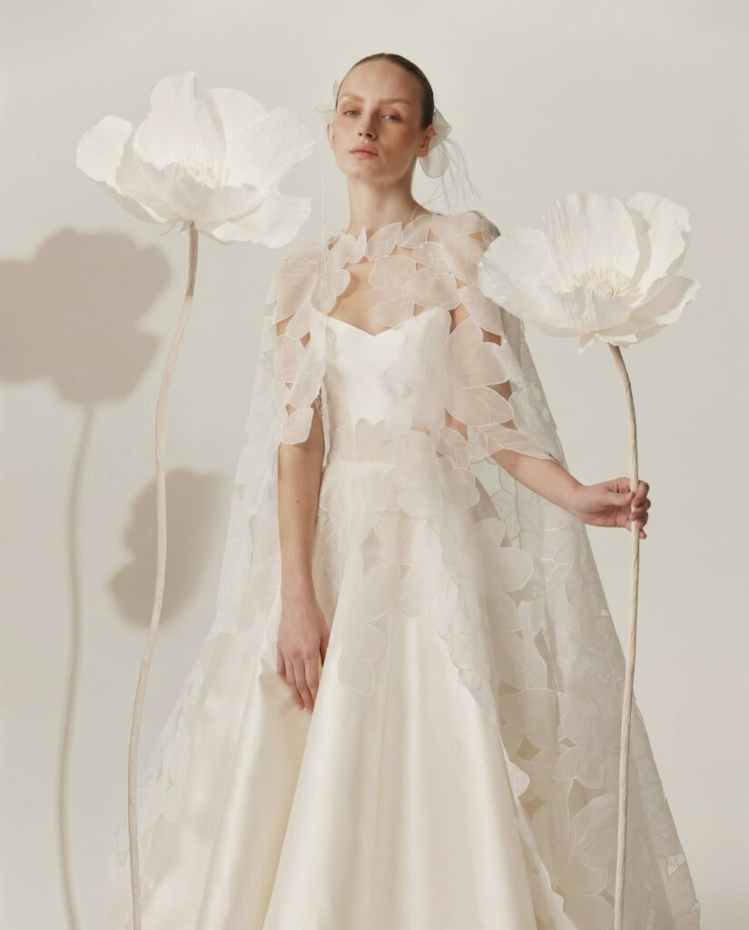 Complementing the gowns, a new world of accessories emerges, designed as a natural extension of each look. Ethereal veils mirror the movement of the florals, flowing seamlessly as if they are part of the gown itself, while sculptural capes add a sense of quiet drama and modern romance.
