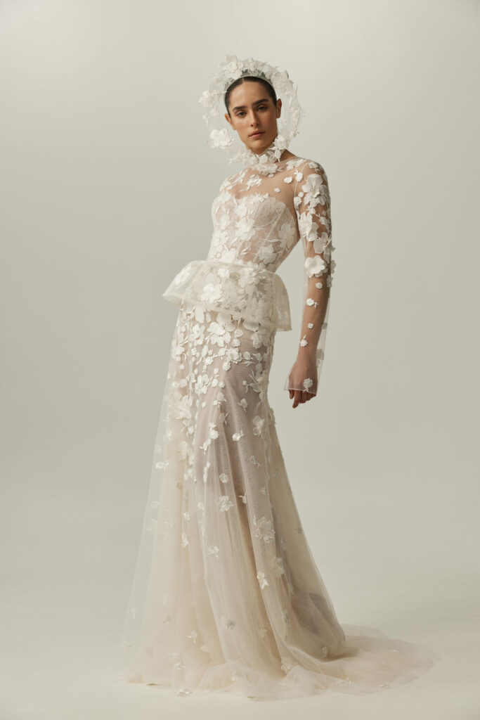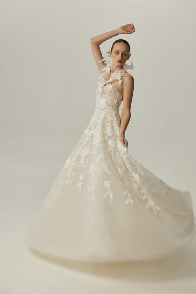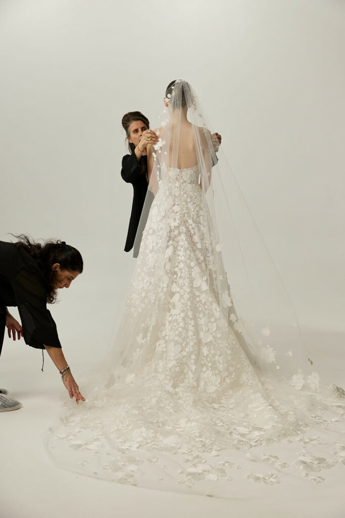 Each gown is created through the signature Mira Zwillinger approach, where every detail is handcrafted in-house with intention and care. Florals are delicately placed and layered one by one, allowing each design to unfold organically, while the entire couture process is rooted in artistry, emotion, and precision.