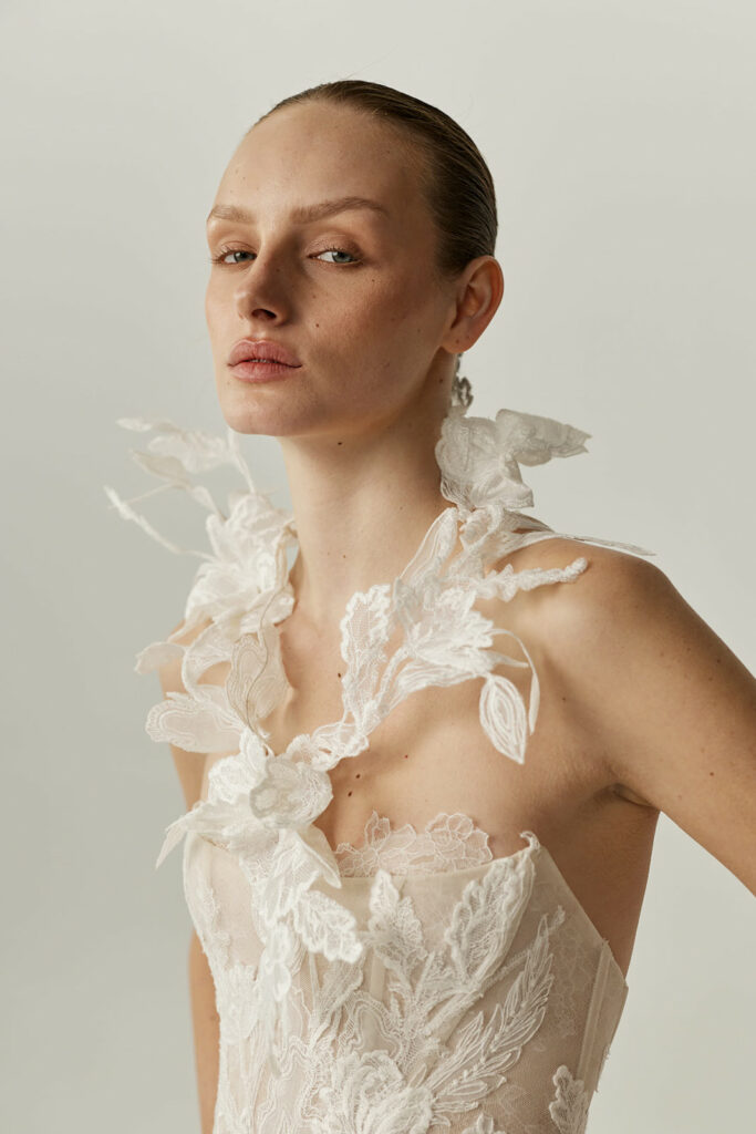 Unique neckpieces emerge as striking focal points, delicately framing the collarbone and neckline with intricate detailing that feels both powerful and ethereal. Crafted with the same devotion to detail, these pieces echo the language of the gowns, blending softness with structure.