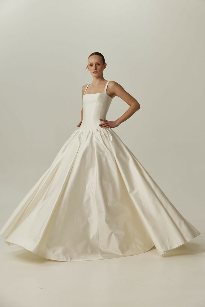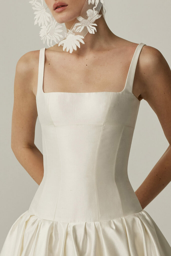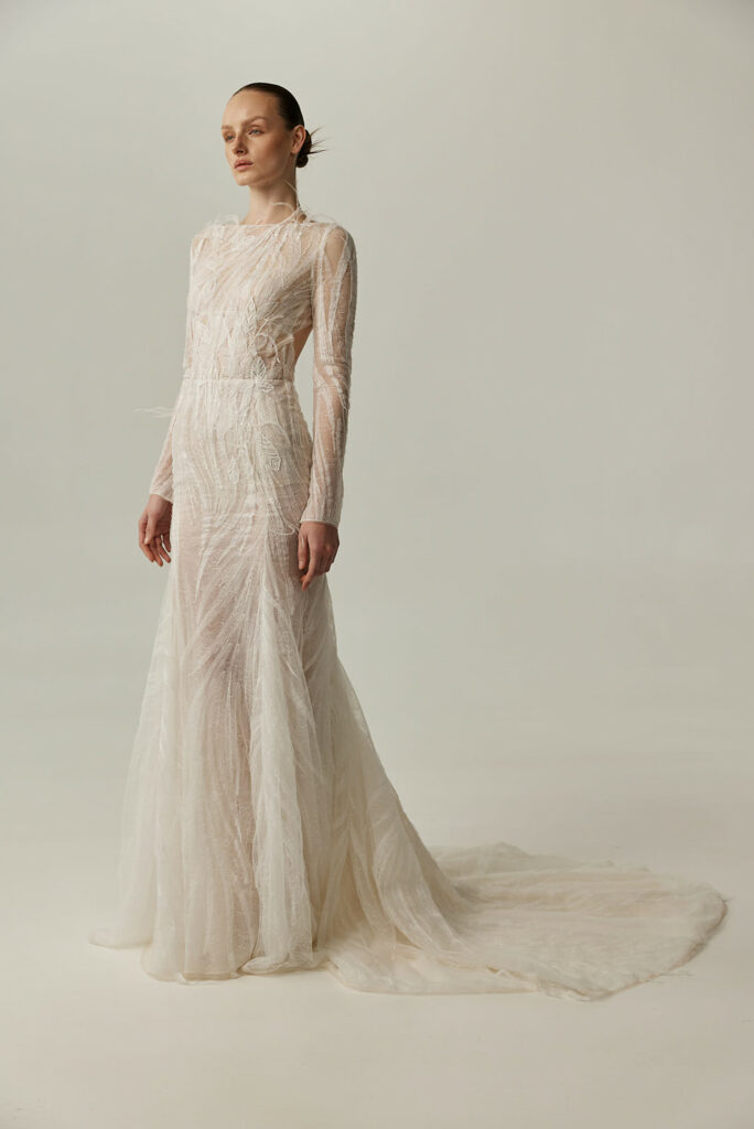 In this collection, structure and airiness exist in perfect harmony. Sculptural silhouettes gently frame the body, while layers of ethereal fabrics create a sense of effortless movement. The result is a feeling every Mira Zwillinger bride recognizes – a gown that is both present and weightless, powerful yet soft.