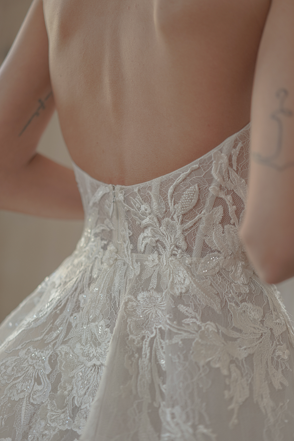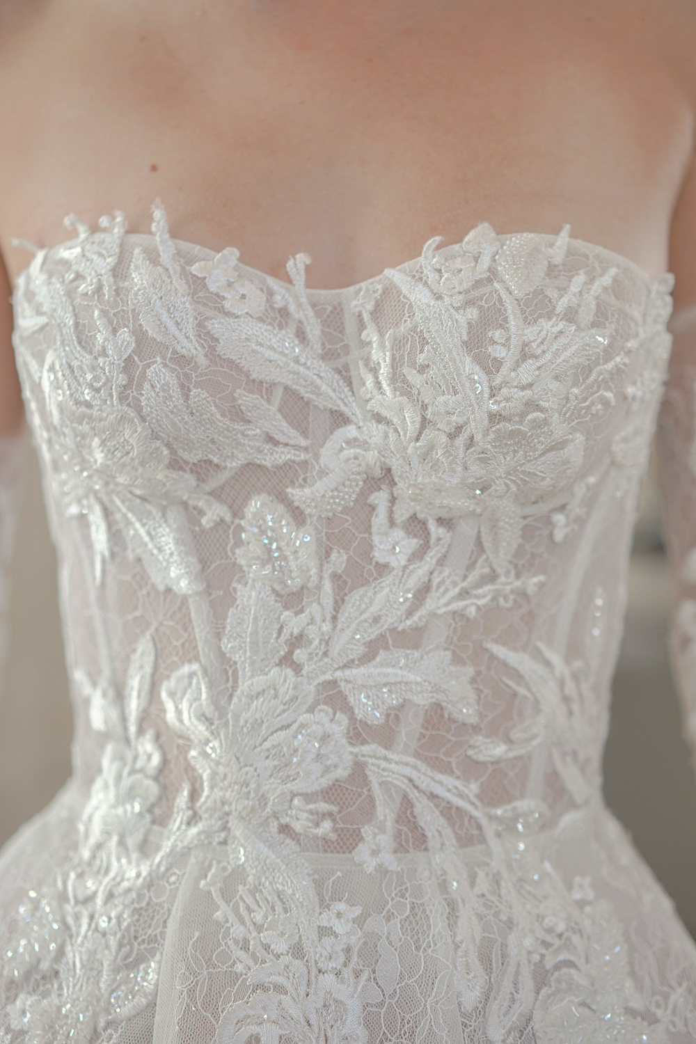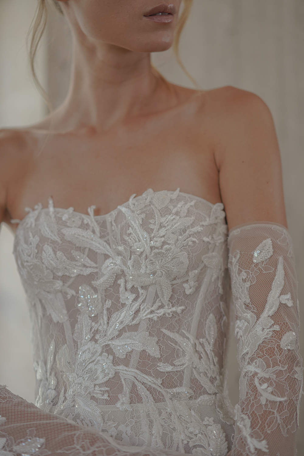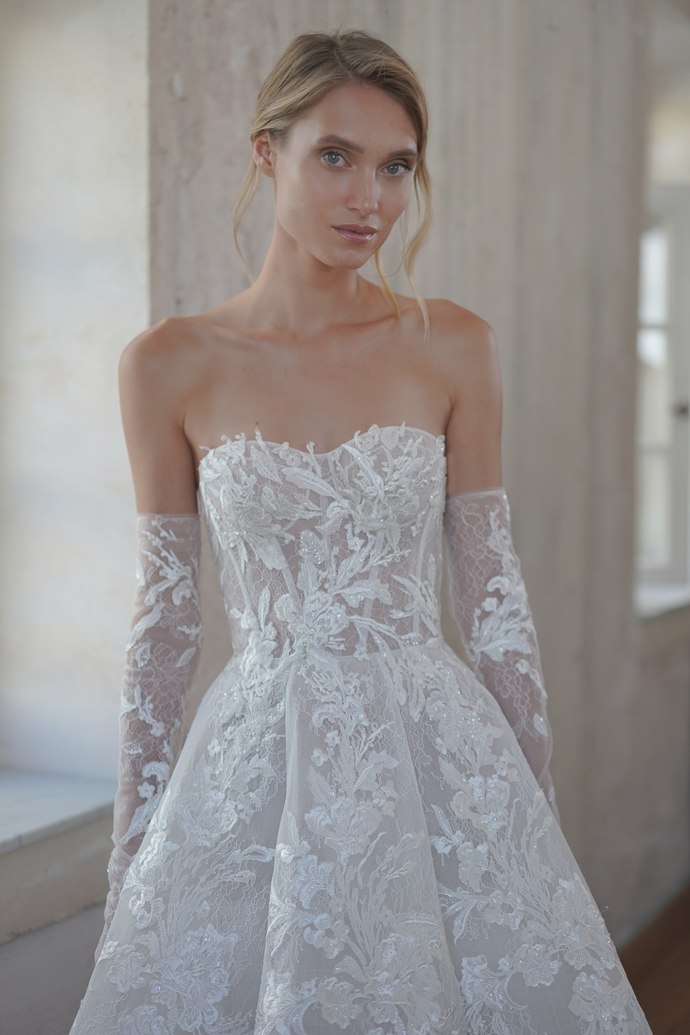 Sweetheart voluminous short dress with striking floral lace. Matching detailed long gloves.