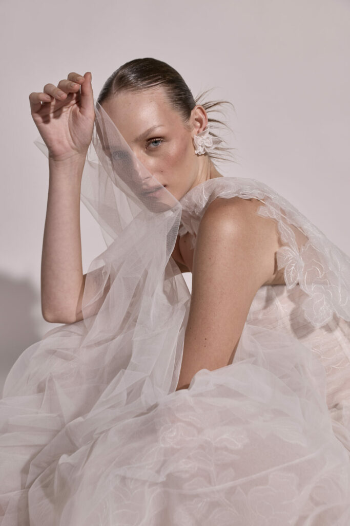 Raffa’s voluminous tulle skirt embodies movement and lightness. Beneath its flowing layers, the intricate texture of the under-fabric softly reveals itself as the bride moves, creating a sense of hidden artistry. The low waistline elongates the silhouette, balancing the fullness of the skirt with refined proportions and a graceful flow.