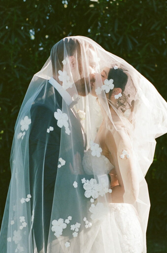 Whether the veil is gently lifted by the wind or draped around both partners, the result is dreamy and cinematic.