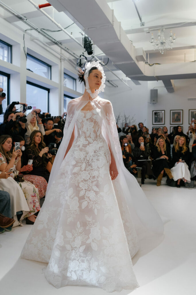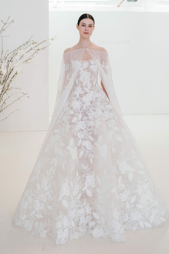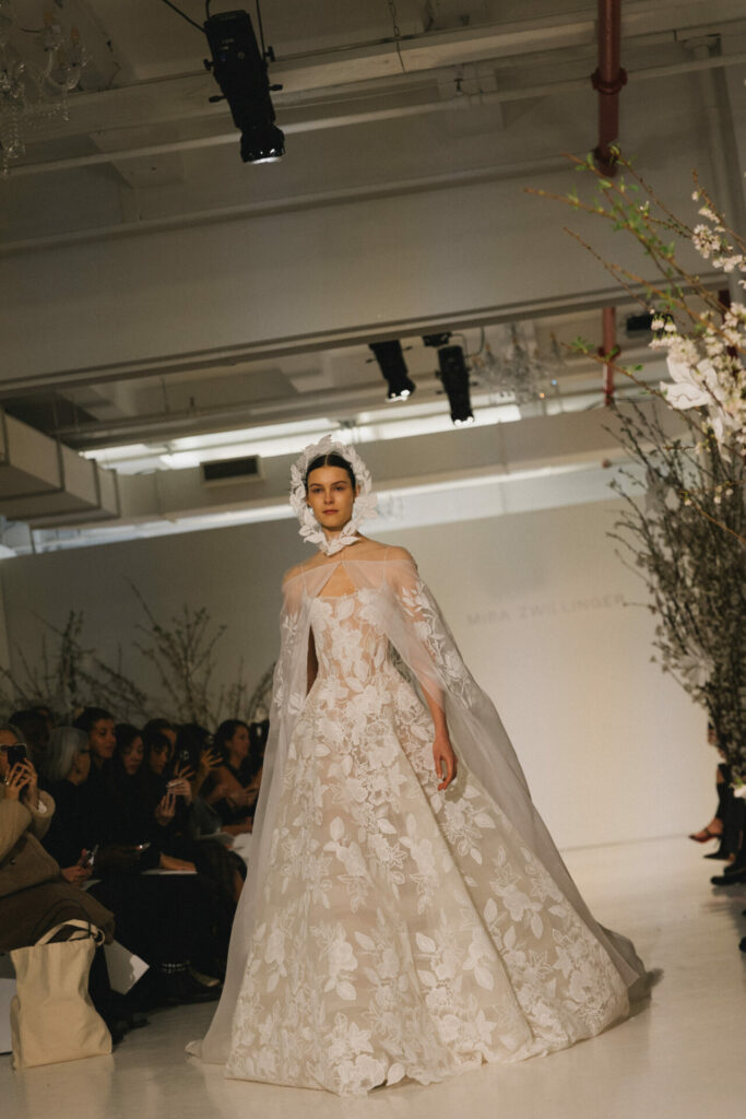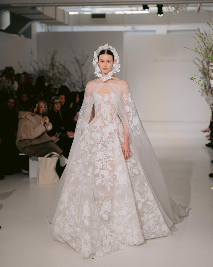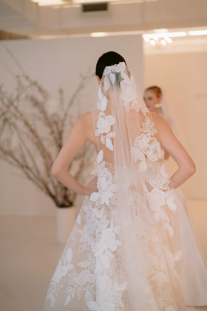 A Mira Zwillinger veil is never just an accessory – it is a continuation of the gown’s story. Crafted to mirror the same floral language, the matching veil extends the design beyond the dress itself, framing the bride in softness and romance.