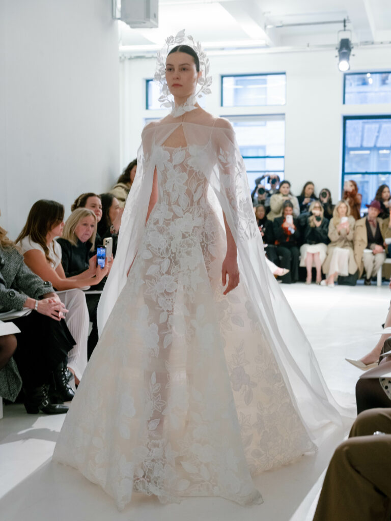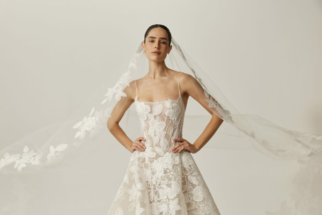 The structured square neckline introduces a sense of modern poise, framing the décolletage with clean, architectural elegance. From there, the gown softens into a world of delicate floral lace appliqués, each one placed with couture precision. In the Mira Zwillinger atelier, every flower is thoughtfully crafted and positioned by hand, creating a gown that is not only beautiful but entirely one of a kind .