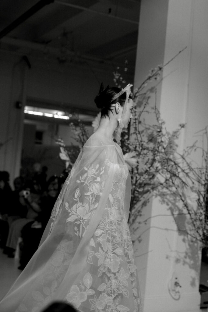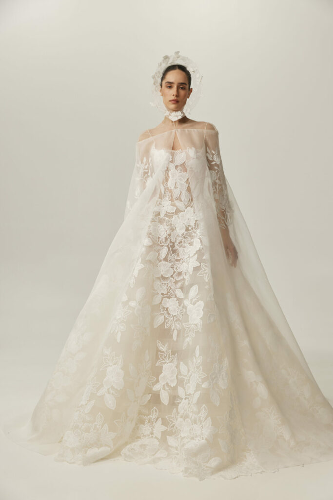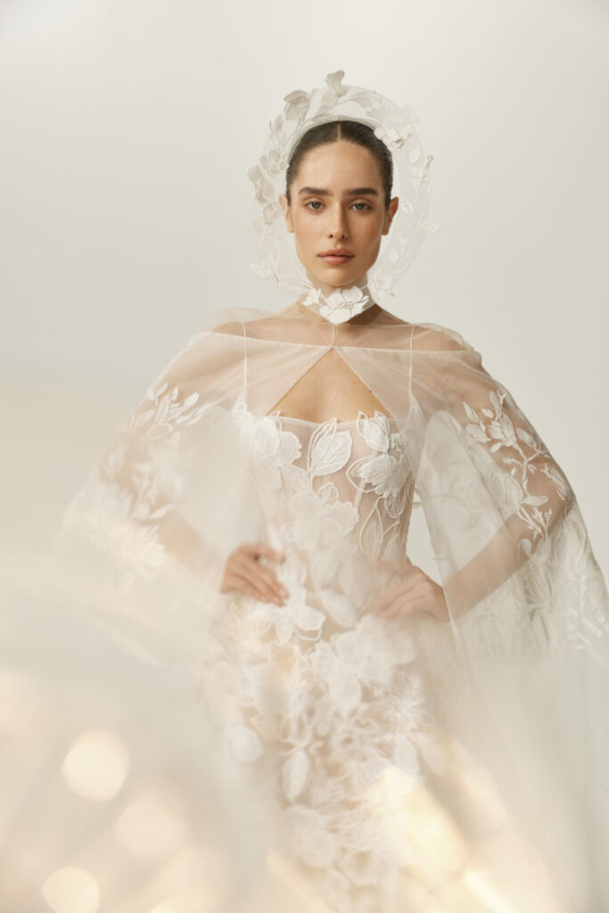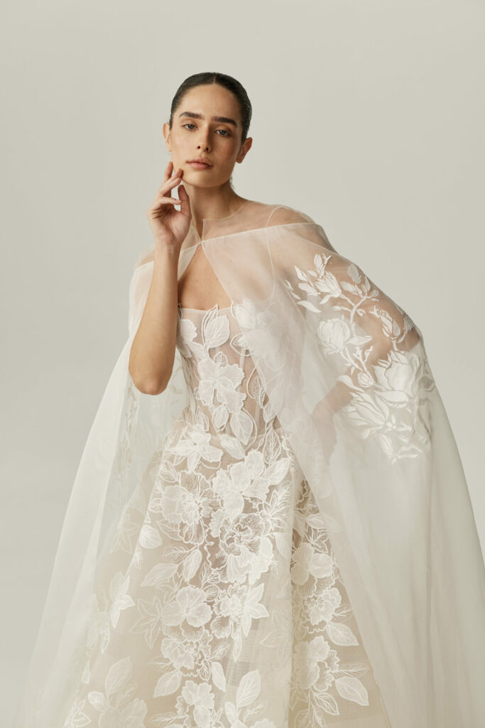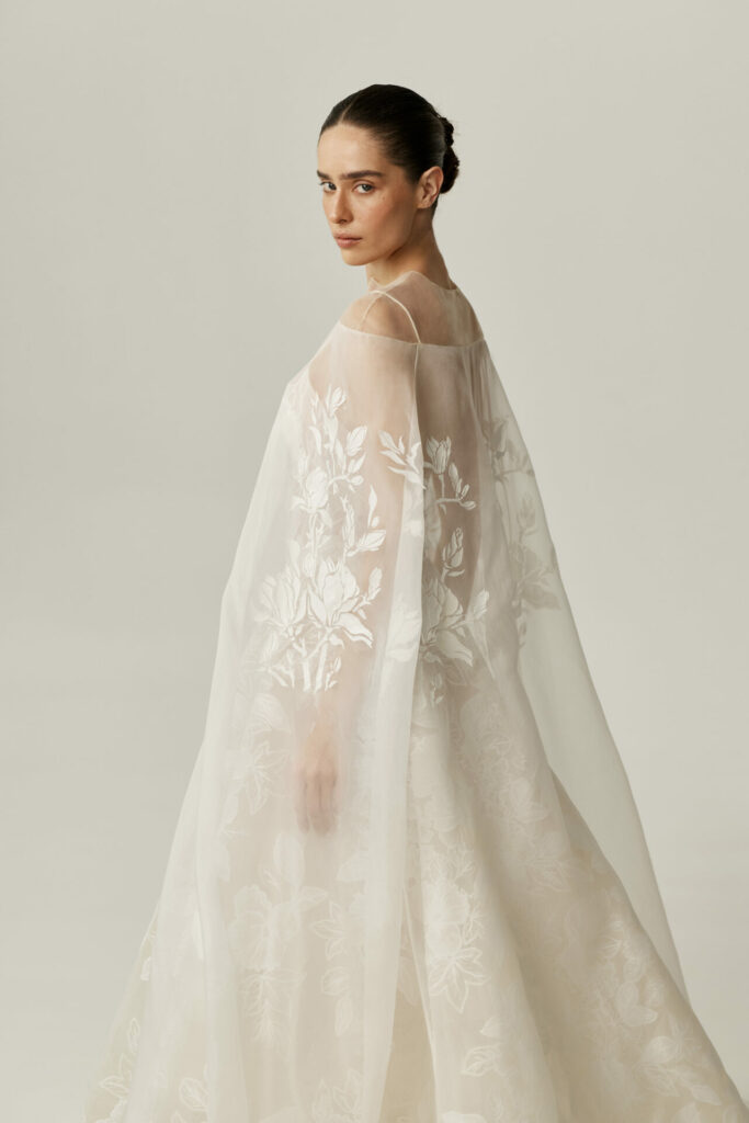 For brides drawn to movement and quiet drama, Sui can be paired with a silk organza cape adorned with hand-printed florals. Light as air, the cape introduces a layer of ethereal volume, floating behind the bride with every step. It transforms the silhouette into something cinematic – perfect for a ceremony moment that feels both powerful and poetic.